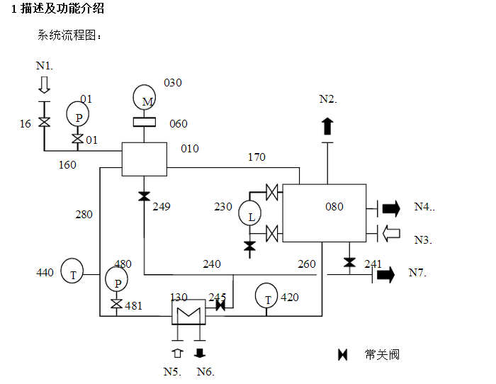 分離器內(nèi)液位由液位計(jì)(230)指示,正常液位在分離器中間位置,如果液位升高,通過(guò)N4口溢流,如果液位下降50mm,通過(guò)N3口補(bǔ)液,以保證分離器內(nèi)液位。排空閥(241)用于徹底排凈分離器(080)內(nèi)的液體。泵(010)中的液體通過(guò)排空閥249排凈。